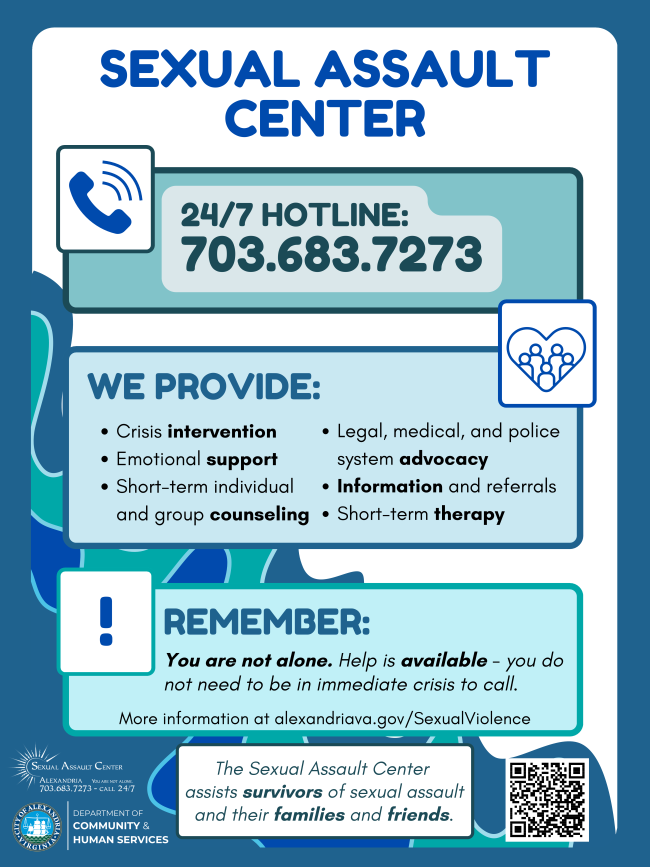 Promote Resources and Supports: The City of Alexandria's Sexual Assault Center offers support to victims of sexual assault -- and their families and friends -- through crisis intervention, emotional support, counseling, and advocacy. Help is available 24/7 through the Sexual Assault Hotline (703.683.7273) and you do not need to be in immediate crisis to call.