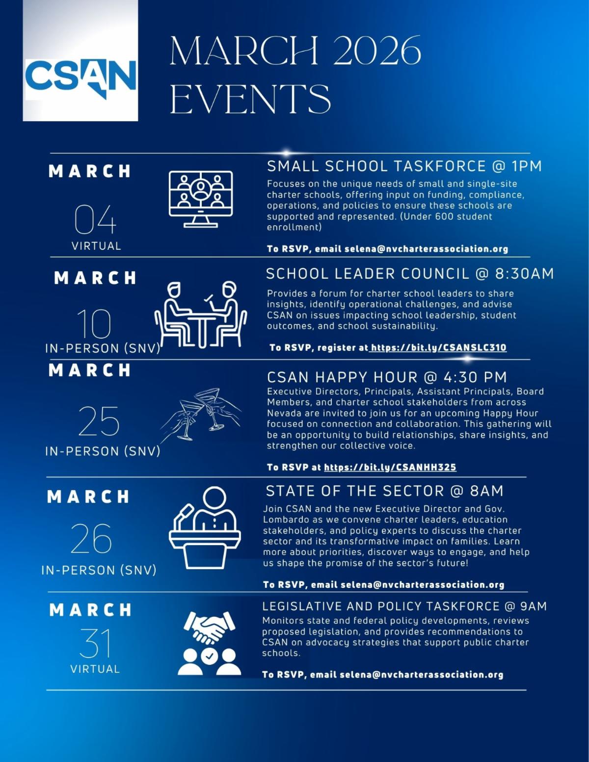 I encourage you to attend our March convenings, including the Small School Taskforce, the School Leader Council, the Happy Hour, the State of the Sector, and the Legislative & Policy Taskforce. These spaces are designed to keep you informed, elevate your voice, and ensure policymakers understand the real impact of their decisions on our schools and students.