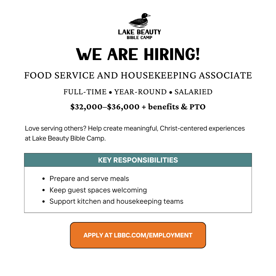 God is already building our summer team—28 staff have been hired so far! We’re still seeking team members for housekeeping, lifeguarding, the kitchen, and a male LIT Leader. Come serve with us this summer and be part of something meaningful.
