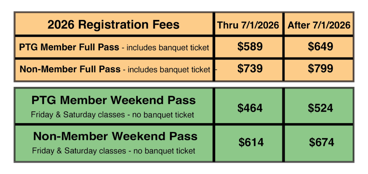 The 2026 convention site is live with class descriptions and more information constantly being added. Bookmark convention.ptg.org and check back for details. Registration opens March 2!