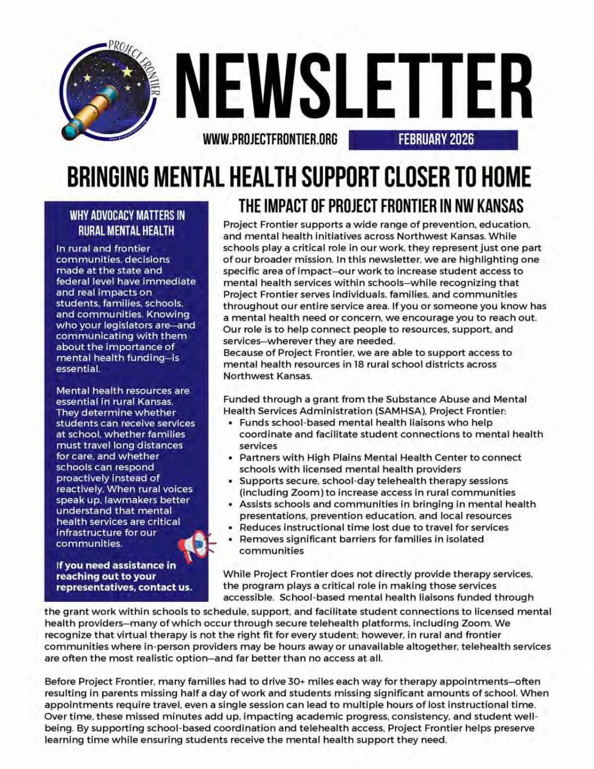 Mental health services in frontier communities exist because people advocate, collaborate, and care. Thank you for supporting Project Frontier and for helping ensure that students, families, and communities across Northwest Kansas have access to the care they deserve.