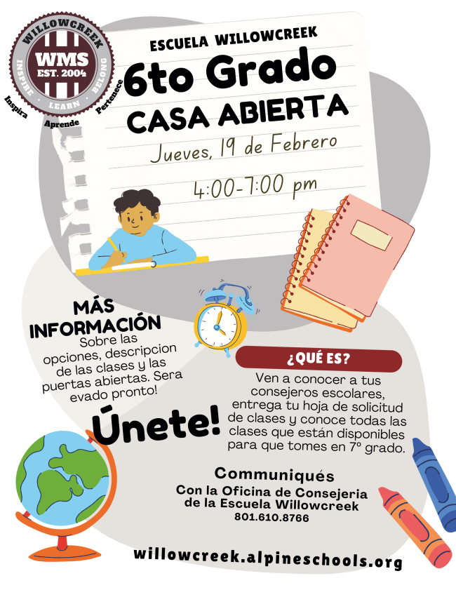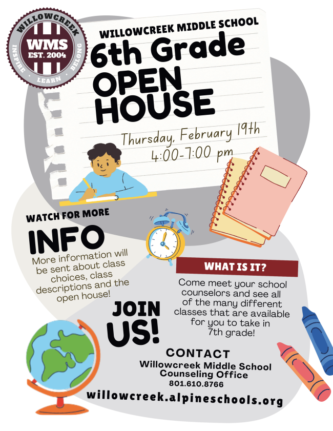 We are so excited to open our doors to our incoming 6th graders for our 3rd Annual Open House. This event will take the place of our winter Parent Teacher Conference. If you would like to meet with your student's teachers, please contact the teacher(s) directly and set up a time to meet with the teacher(s) on a different day.