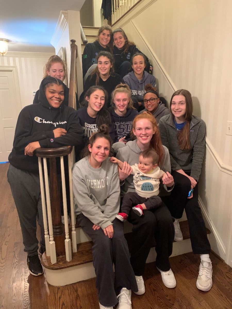 The girls basketball team celebrates with our beloved trainer, Gaby Haubenstricker.