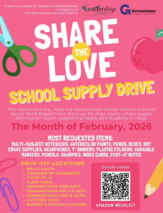 - creating new connections in the community for school supply donations to support Germantown students in need of school supplies all throughout the year. See the Share the Love School Supply Drive Flyer.