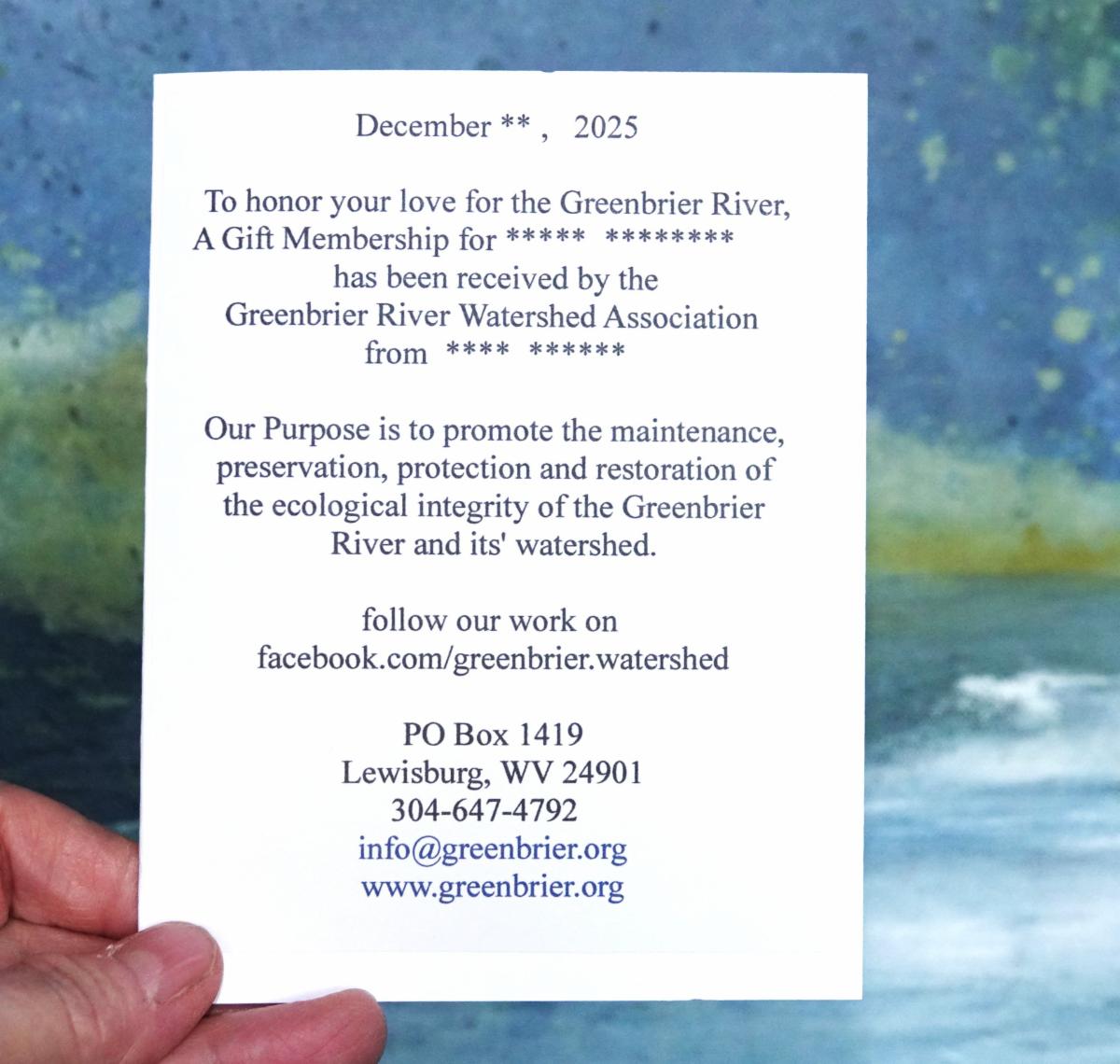 Need at last minute gift for someone you know who loves the Greenbrier River? Give them a gift membership! We will send them this acknowledgement card and keep them abreast of our work through our newsletters. Follow the link to memberships here https://wordpress.greenbrier.org/join-us/membership/ or use the QR code in the above newsletter.