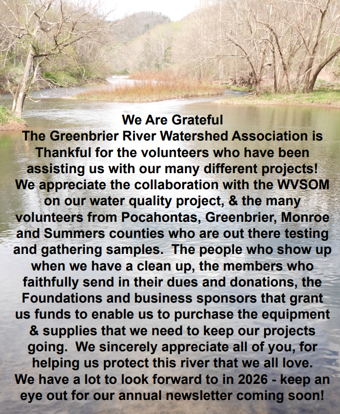 We dream of continuing our programs to keep our waters clean and healthy for all. We dream of growing our membership and volunteer numbers. We dream of continuing our water quality project and educational programs. Would you please consider a donation or membership? Any amount helps and we sincerely appreciate your contributions. You can go directly to https://wordpress.greenbrier.org/join-us/donate/ and make a donation of your choice or become a member! Our mailing address is PO Box 1419 Lewisburg, WV 24901 Thank you!