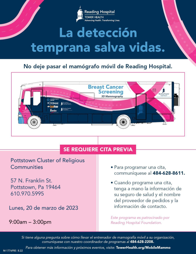 On March 20, Pottstown Cluster of Religious Communities will be hosting the Reading Hospital Mobile Mammography Coach.