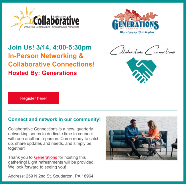 Please continue to keep us informed of what's happening with you in Bucks and Montgomery Counties. The information here comes from you, with links to our website for more complete information and resources. Send your events and updates to Kristyn: kristyn@bucksmontcollab.org. Thank you!