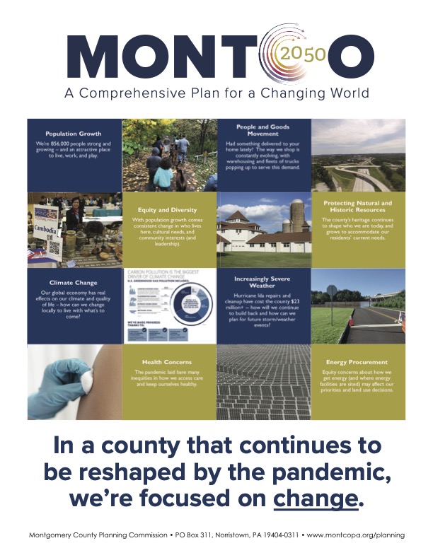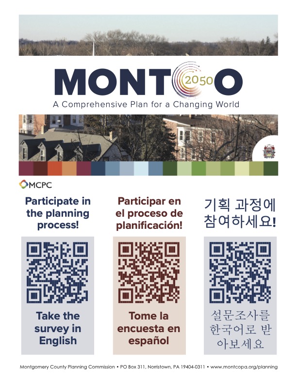 The Montgomery County Planning Commission has started work on Montco 2050, the next comprehensive plan for Montgomery County. This plan will guide overall growth and future development and will help the county in making planning decisions with an outlook to 2050. It will focus on broad issues that affect everyone’s quality of life. Public opinion is important as the plan will ultimately reflect the needs of county residents, and Montco would like to hear from as many voices as possible!