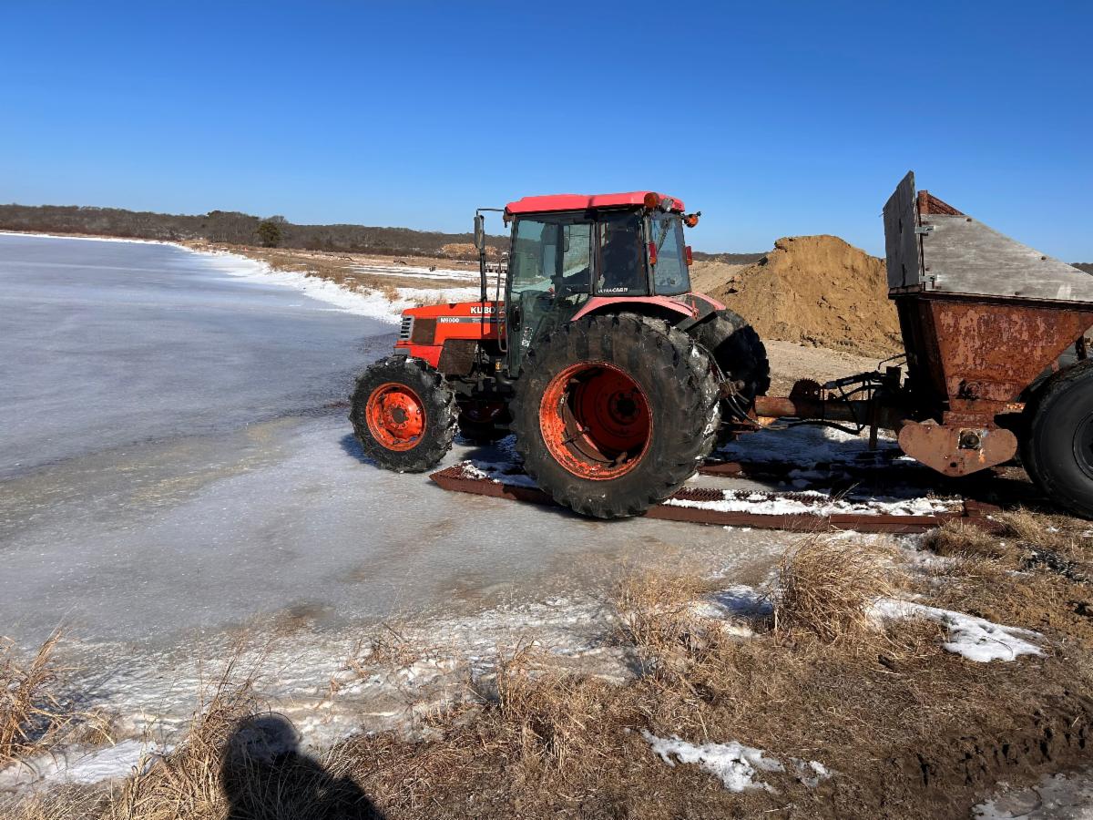 Once the cold temperatures turn the floodwater into ice, typically requiring 3-4 inches to support equipment, we can access the bogs to spread sand, a cultural practice dating back to the early 1800s. When the ice melts, the sand sifts into the vines, stimulating new root development and covering bare wood at the base of the plants, which leads to renewal of the root system and production of new shoots.