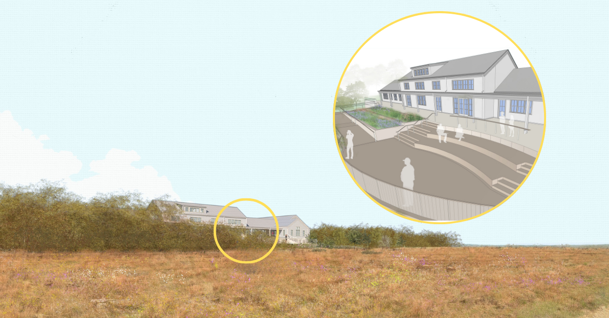 Rendering of the The Milestone Center with an inset rendering of the outdoor education & community engagement space.