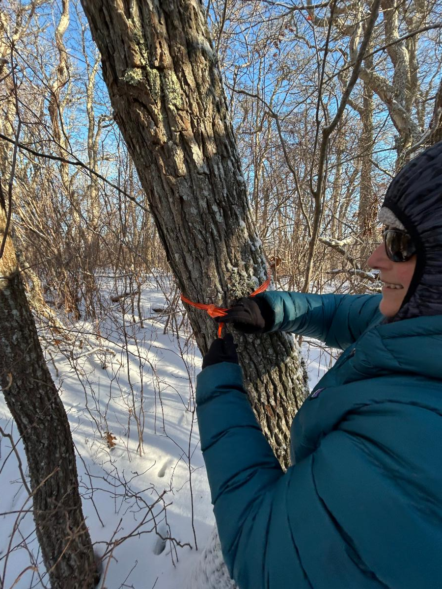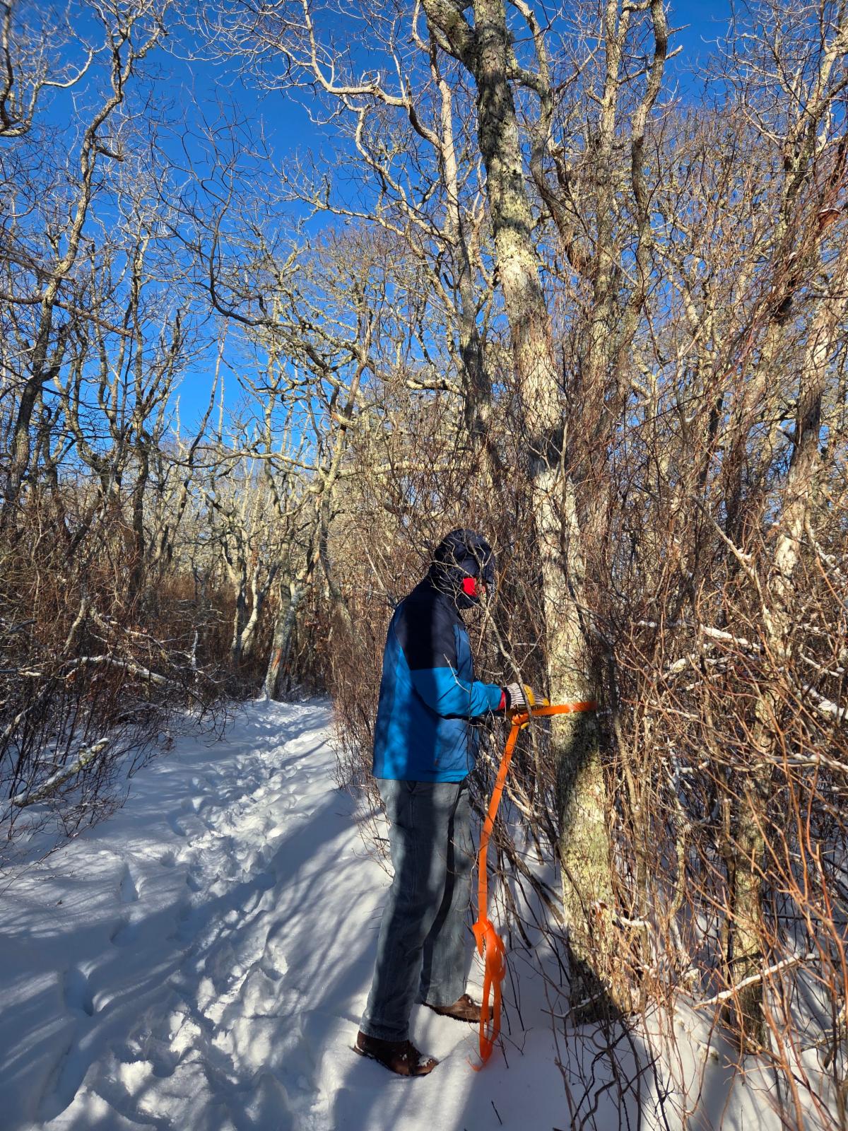 Sassafras trees across Nantucket have been dying in recent years from an unknown pathogen similar to laurel wilt. Our ecologists Kelly Omand and Coleman Miller are walking trails to identify dead trees that could pose safety hazards and flagging them for our Land Management team to remove. They spent time recently at Masquetuck to tag a number of trees with orange survey tape.
