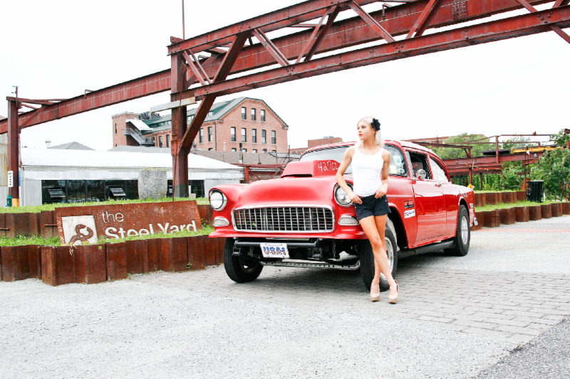 Kate was introduced to the Steel Yard when she started going to the annual cruise night. After a few years of attending the cruise night and a love for the location, she asked for permission to be able to photograph on the grounds with a car and model. With the response of yes, she began planning the photo shoot at the Steel Yard. The model featured in this photograph is Anne Ransom who is posed with Brian Chaplin's 1955 Chevy. You can view more of Kate's work on her website at