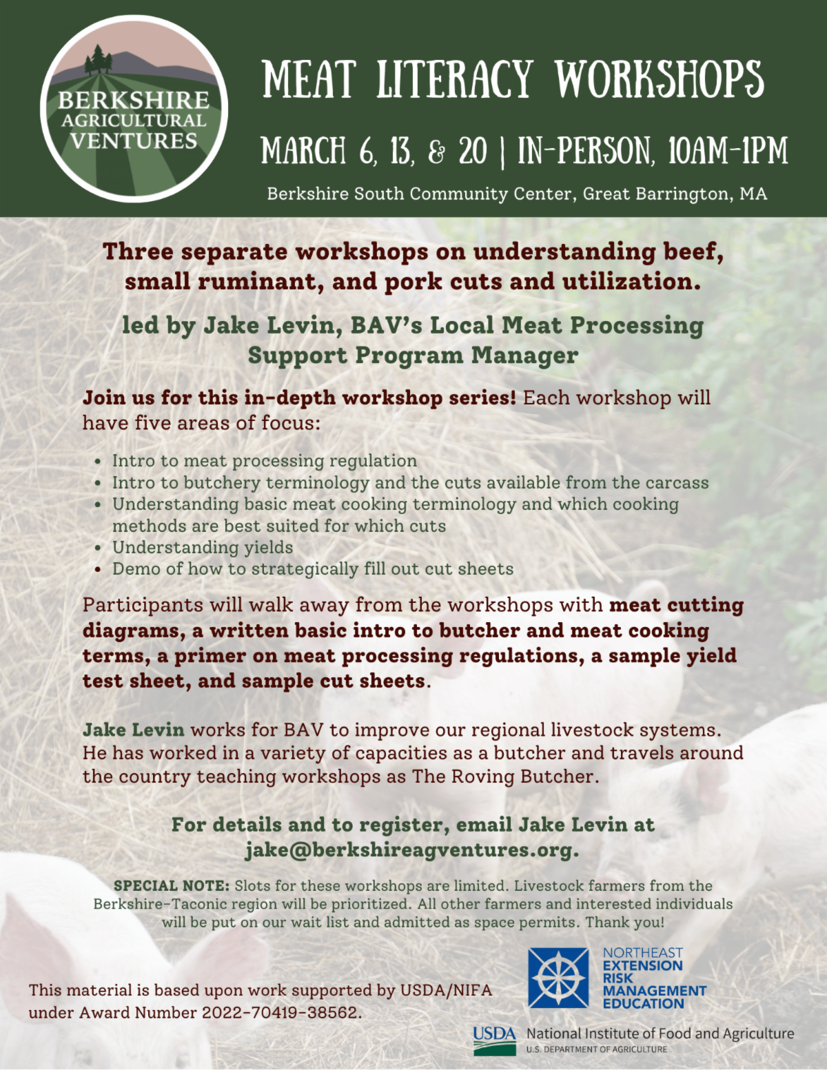 Meat Literacy Workshops for livestock producers, led by BAV's Jake Levin and held at Berkshire South Community Center in Great Barrington, MA. See flyer above for details.