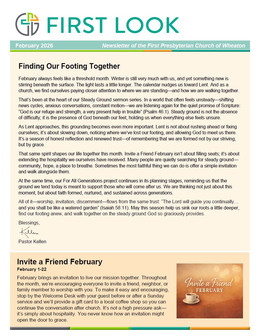The First Look monthly newsletter is published at the beginning of each month, and is found on the church website homepage in the Resources area. If you or someone you know would like to receive a printed copy of the newsletter, please call or email the office and we will be happy to send you a printed version.