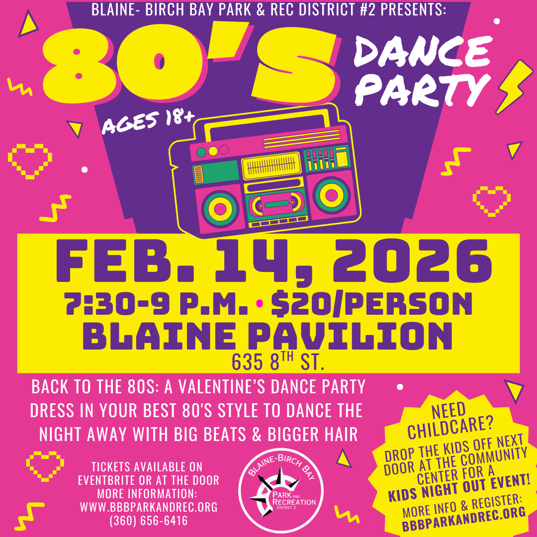 Enjoy food, drinks, 80s nostalgia décor, and a photobooth for the ultimate throwback night at the Blaine Pavilion. Ages 18+.