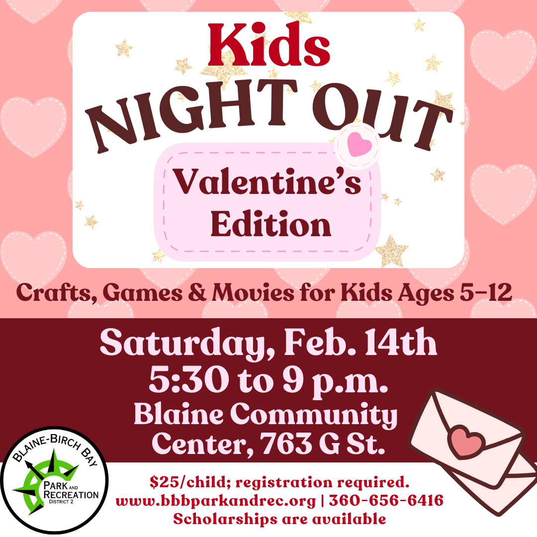 Thursday, Feb. 5th, 2026 Time: 5:30 to 9 p.m. Location: Blaine Community Center 763 G St. Cost: $15 per child, registration required.