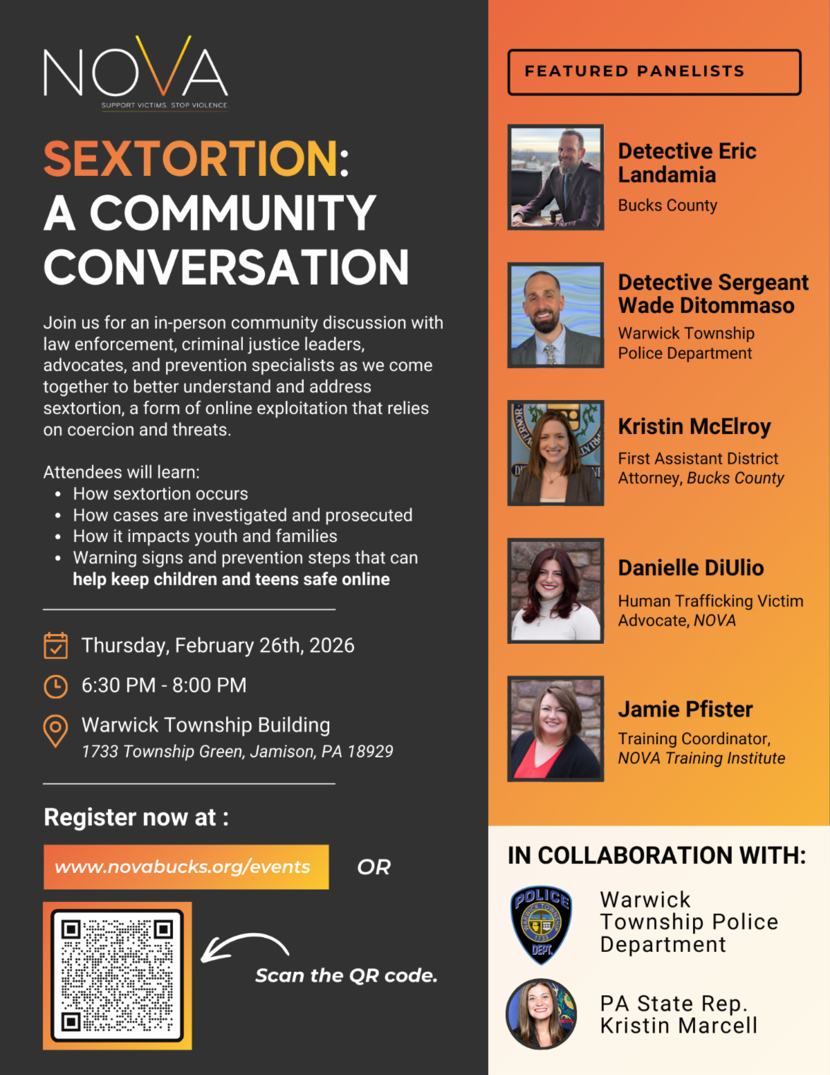 To help families navigate this topic in a clear, supportive way, NOVA is hosting a free, in-person community conversation focused on protecting kids and teens online. In collaboration with the Warwick Township Police Department and PA State Representative Kristin Marcell, this panel will bring together law enforcement, victim advocates, and prevention specialists to talk about what sextortion looks like, warning signs to watch for, and practical steps parents and caregivers can take to reduce risk.