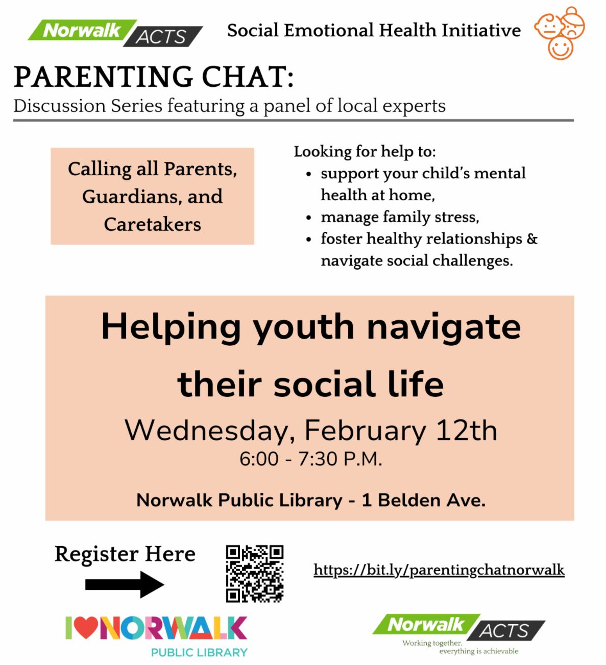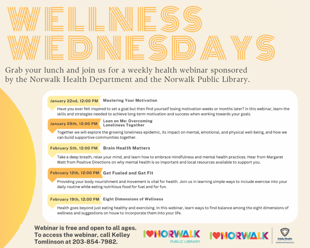 Our partner focus for the month of February is the Norwalk Health Department and their Wellness Wednesday Webinars in collaboration with the Norwalk Public Library. | To access the free webinar contact Kelley Tomlinson at 203-854-7982. We encourage you take advantage of the next 3 webinars as mindfulness, fitness, and wellness is key to showing up as your best self. | |