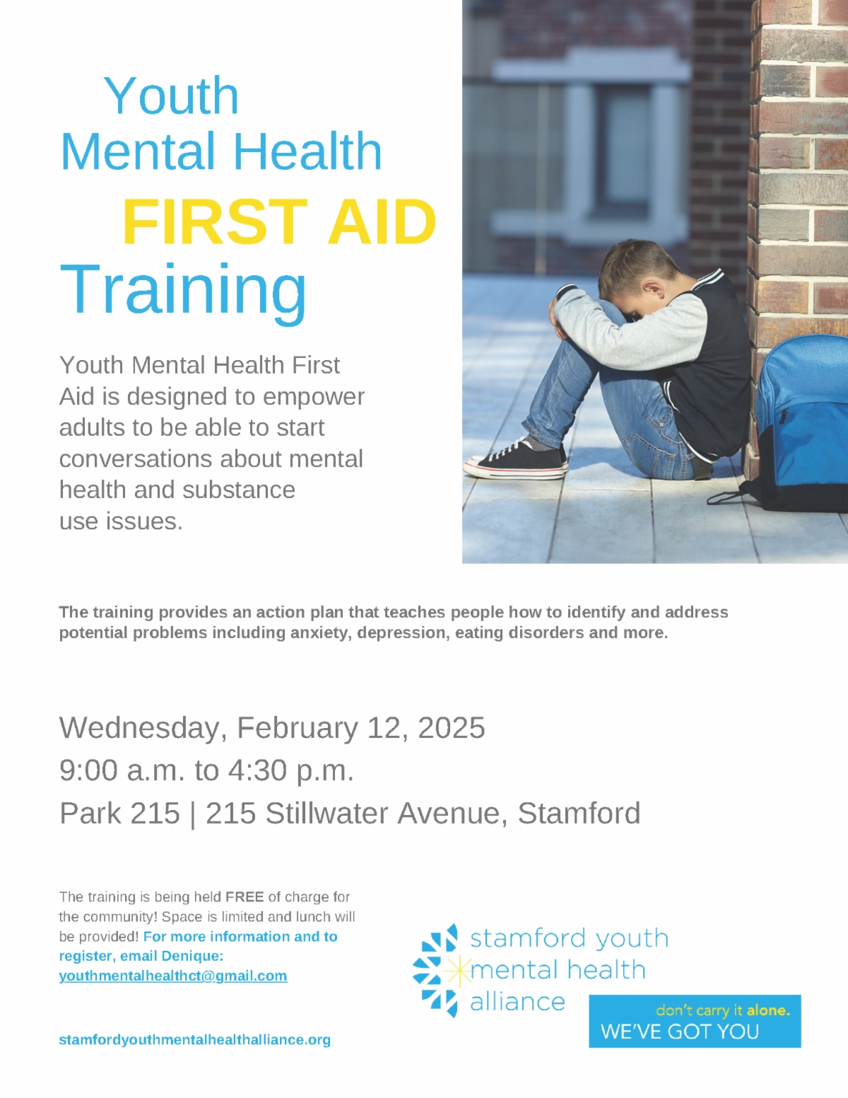 The Stamford Youth Mental Health Alliance (YMHA) is offering Youth Mental Health First Aid (YMHFA) training for adults who interact with young people.
