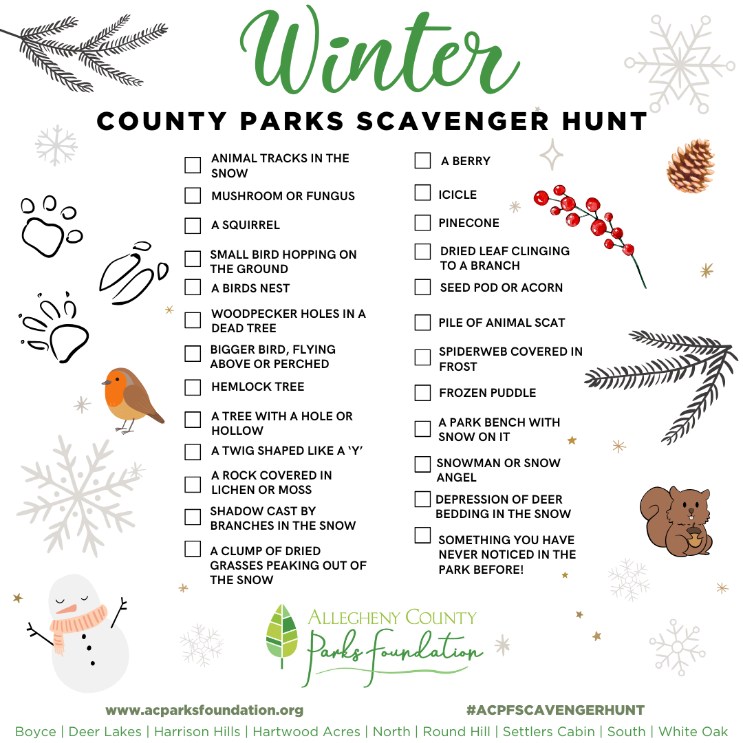 If you are looking for a fun outdoor adventure to enjoy in your county parks, then check out our Winter Scavenger Hunt! Our latest blog post shares everything you need to know to participate in the scavenger hunt, plus suggestions for trails and open spaces in all nine county parks you can explore.