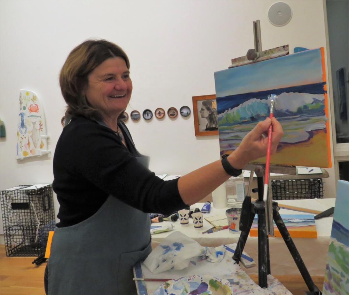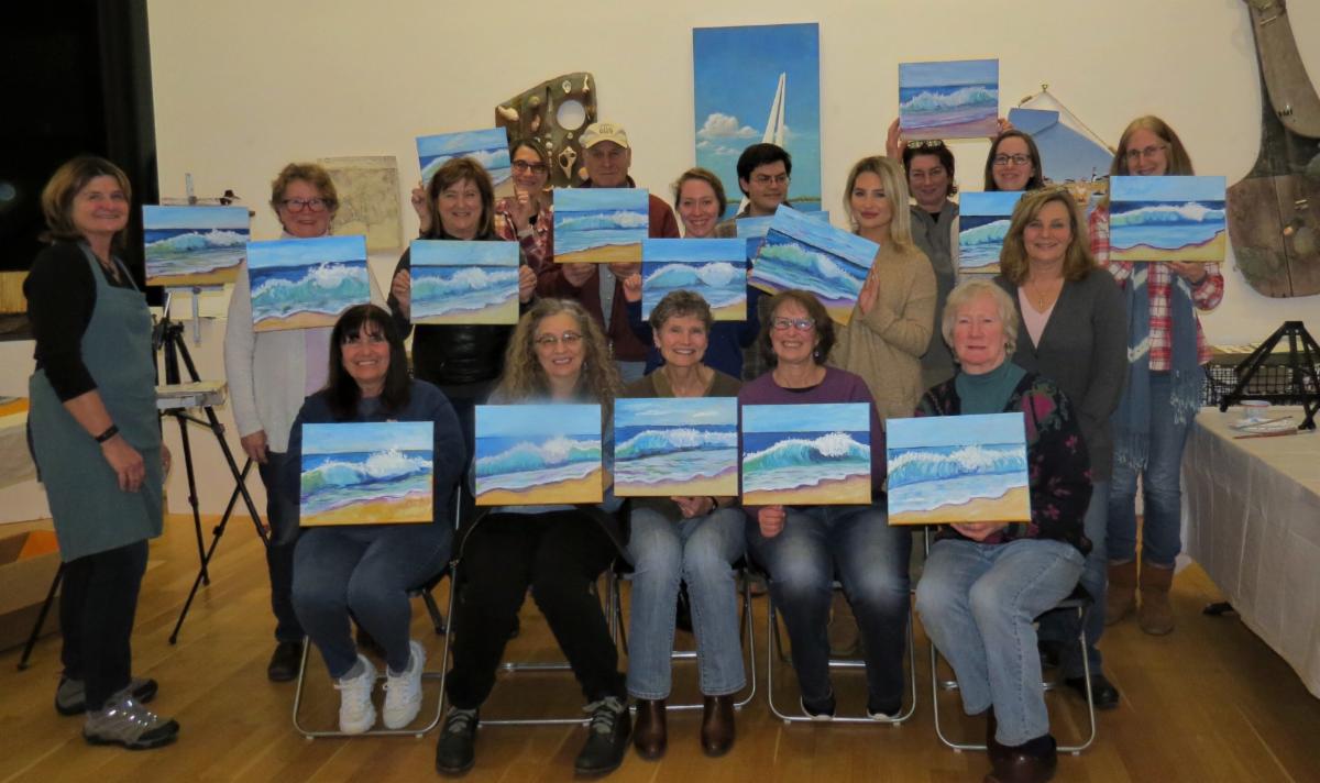 Artist Barbara Healy instructing the art class at Brushes & Brews. Below, artists show their finished paintings.