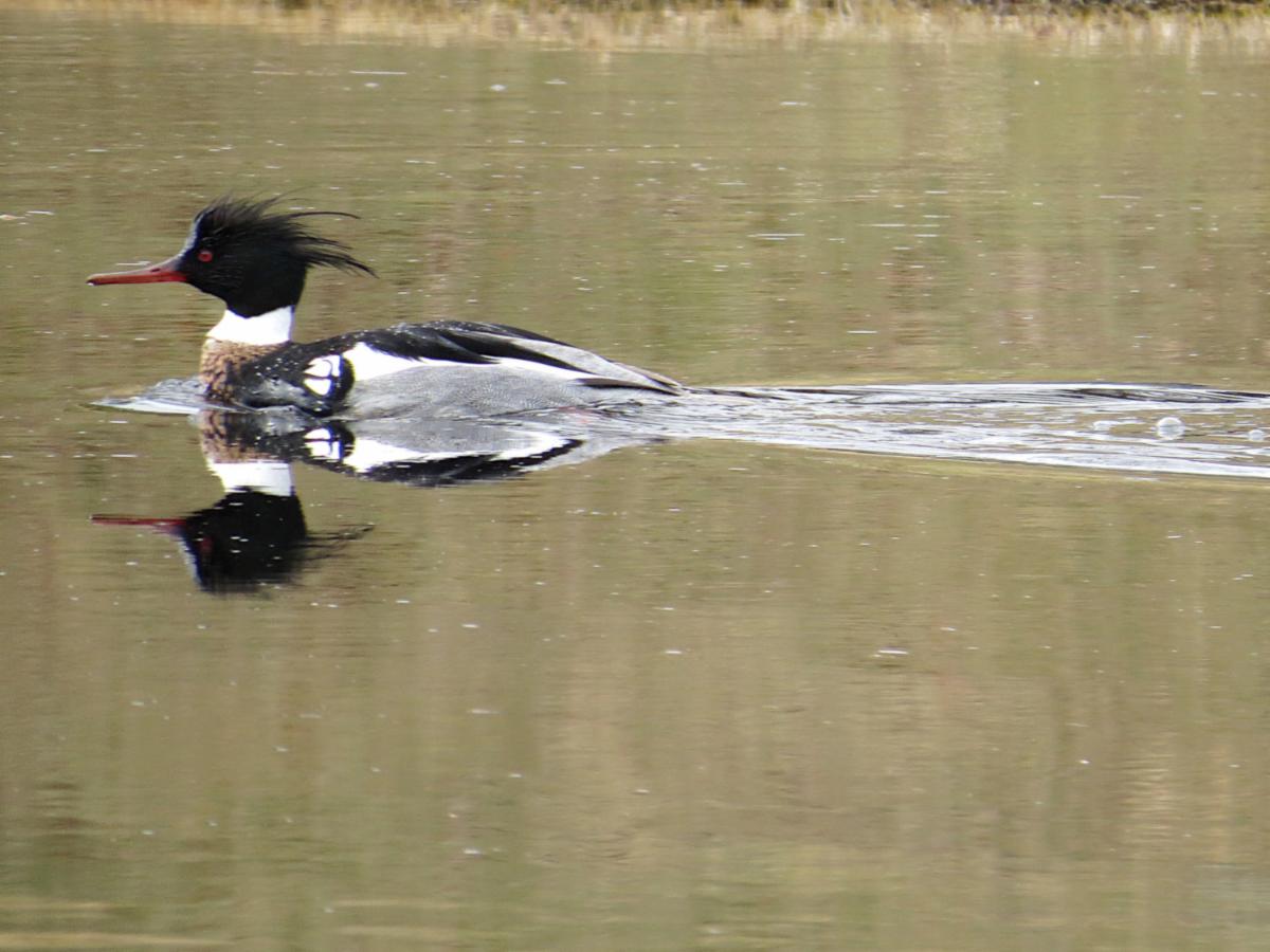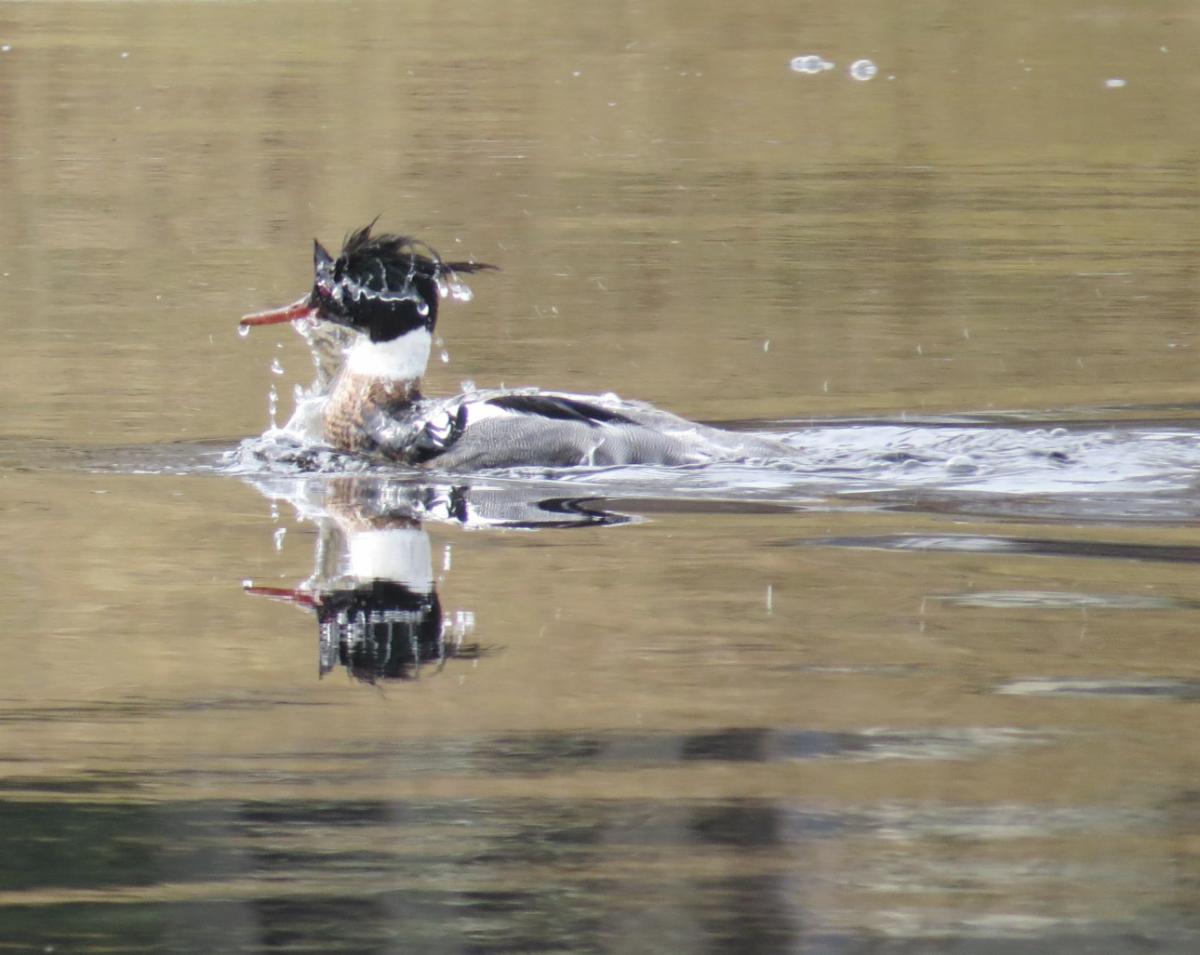 This Red-breasted Merganser was spotted doing some fishing here at the Head of Westport this week. While Red-breasted Mergansers spend most of their lives in northern lakes and rivers, within northern forests and into tundra regions of Canada, they are commonly seen here in the Westport River during the winter months. They are small, crested, fish-eating ducks that escape the frozen north to feed in more southern coastal waters. They forage by diving and swimming underwater. While sometimes seen in large assemblages of hundreds of birds, they are usually seen in small numbers in Westport. They will soon be returning to their cool northern waters to breed. We’re glad that this beautiful duck visits us here on the River each winter.