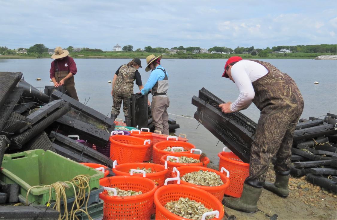 The experimental work is winding down. This is the final year of the four-year project. This summer over 200,000 of the oysters grown in Cockeast Pond were given to the Town of Westport. Once the oysters reach market size they must be removed from the pond, which is closed to shellfishing. These oysters were transplanted to a contaminated relay site in the Westport River with the help of Chris Leonard, Westport Director of Marine Services and volunteers. This summer the last 30,000 oysters in the pond will be used in small scale experiments. After the results are compiled, we plan to have Dr. Howes and members of his team present the data.