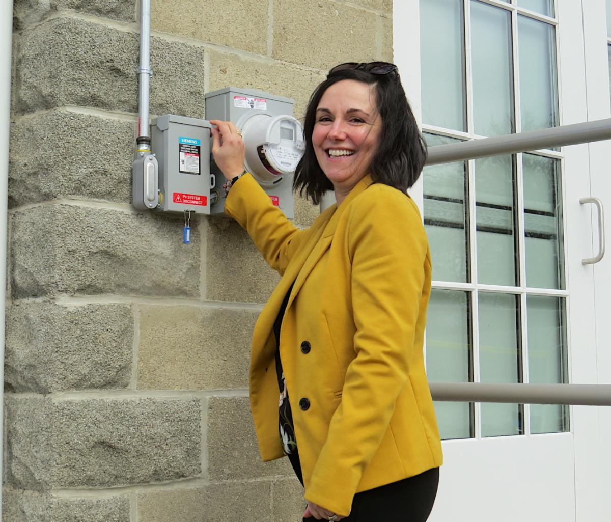 At right, Julie Ramos Gagliardi, 1st Vice President for Corporate Giving and Community Relations gets ready to "Flip the Switch" for the new solar system at the River Center.