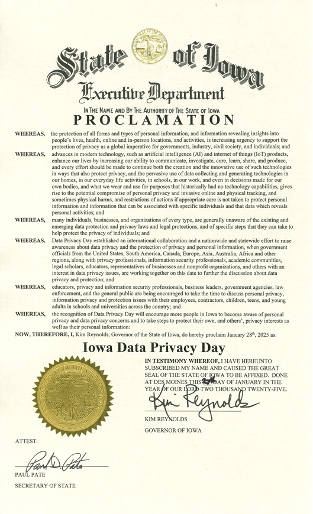 Guess what? That request to the Iowa Governor to proclaim January 28 as 2025 Iowa Data Privacy Day, for the 16th year in a row was approved! I received notification on January 27. The image is the first image in this newsletter, above. Did you do something special for Data Privacy Day? Or, as so many organizations are now doing, for Data Privacy Week? We’d love to know what you did! Send us a message.