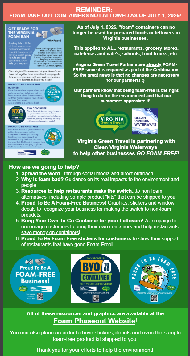 This month's messaging comes from Clean Virginia Waterways' and Virginia Green Travel's partnership on their foam phaseout toolkit. Share the link to the foam resources webpage so that businesses and community partners can be equipped with the tools for an easy, sustainable transition away from foam products. Please direct your network to cleanvirginiawaterways.org/foam-phase-out, and utilize Virginia Green Travel's talking points from their email launching the EPS campaign! Be sure to tag Clean Virginia Waterways and Virginia Green Travel for additional reach!