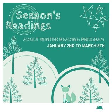 Season's Readings - our fifth annual adult winter reading program. Pick up one of our designated reading logs. For every book you read or listen to, fill out a log and put it in one of our prize drawing gift bags. There are ten great prizes to choose from, and you may submit as many entries as you'd like. What better way to pass the cold winter days than by warming up with a good book? And your winter reading could win you some cool prizes from the library!