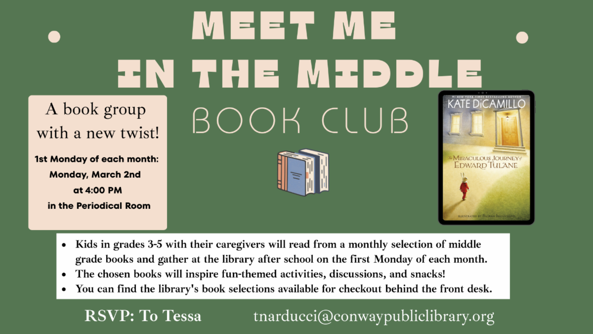 March's pick will be The Miraculous Journey of Edward Tulane by Kate DiCamillo. RSVP to Tessa at tnarducci@conwaypubliclibrary.org and pick up the book at the library.