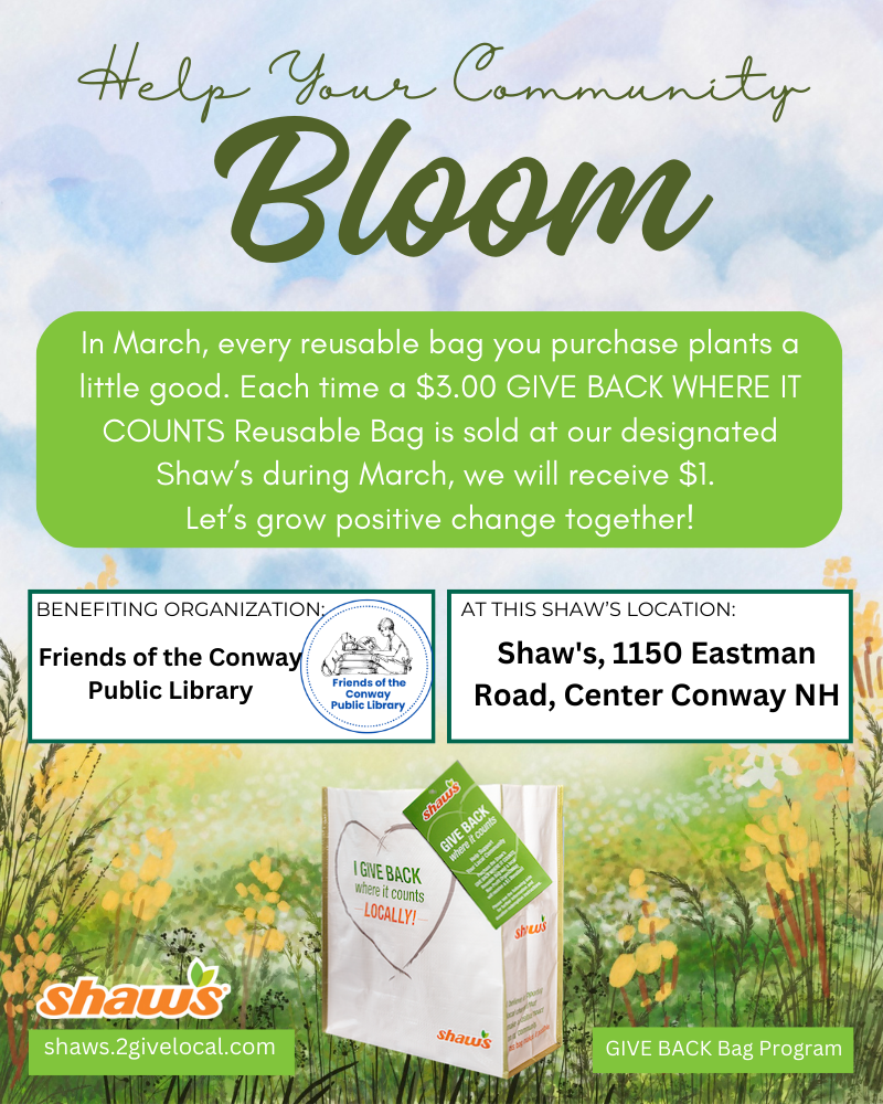 Your Conway Public Library card now grants you access to materials at the Ossipee, Jackson, Madison, and Cook Memorial (Tamworth) Libraries. Present your Conway library card to borrow items at any NNHLC library, or browse our shared catalog to request items be transferred to Conway for convenient pick-up.