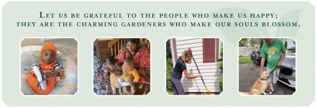 Photos Above: RJ’s first Halloween; Angie’s new son, RJ, meets Darcey. Instant friends! Our lovely caregiver Marisha, having finished cars tasks, helping out her client by gardening; Company VP Tom and Darcey getting ready for a walk.