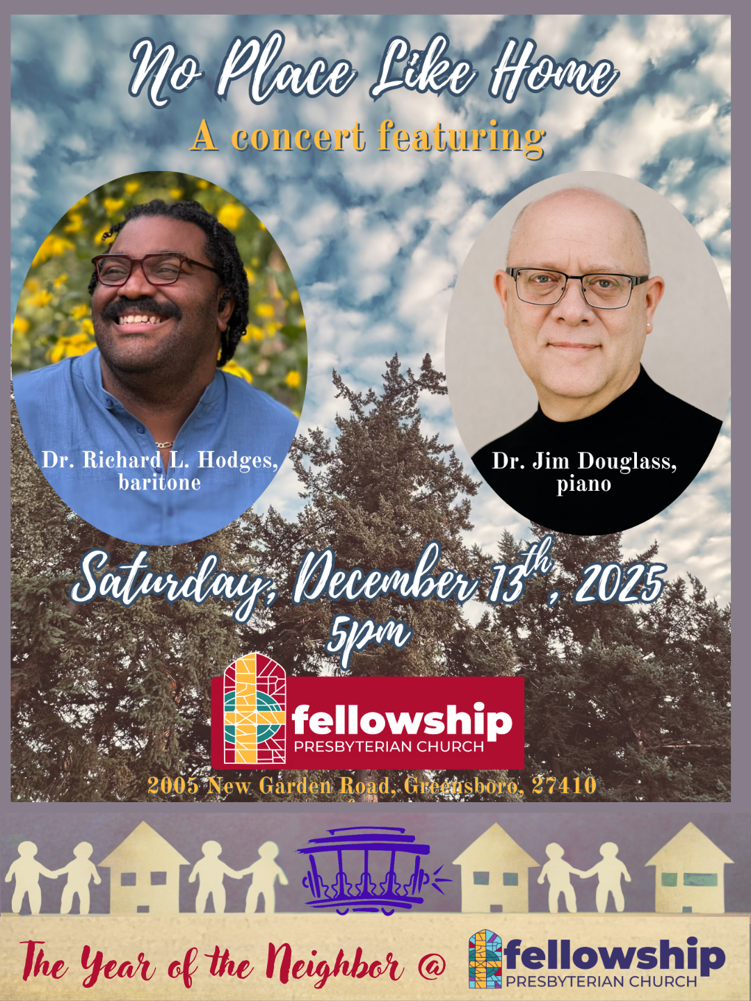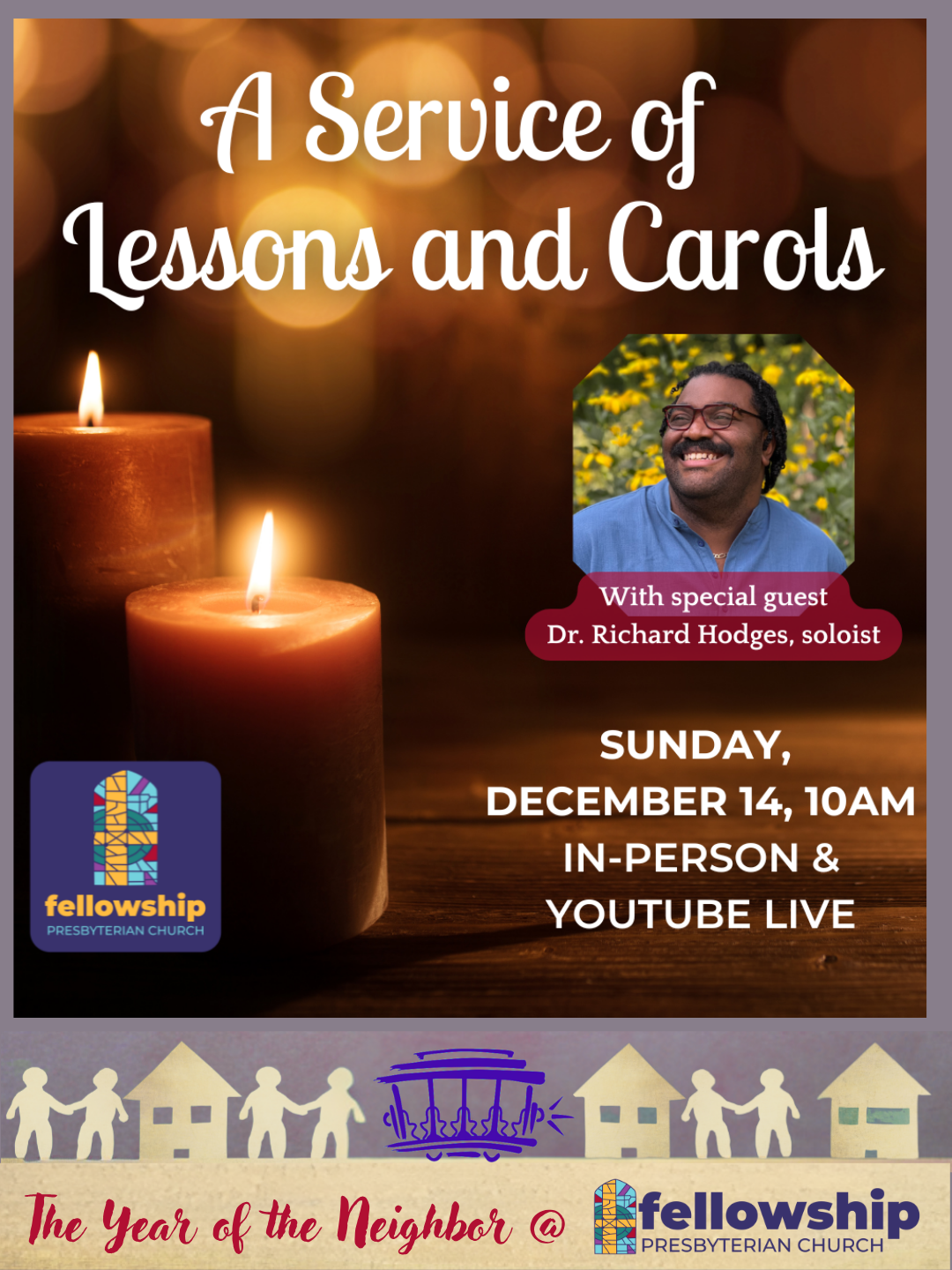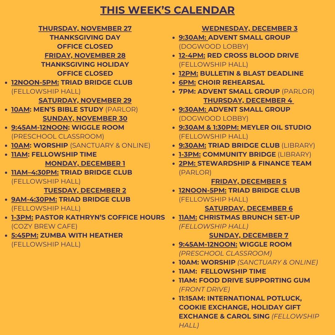 I hope that you are also marking your calendars to join us for some very special events in the life of our congregation in the next several weeks, including a potluck, cookie, and gift exchange after worship next week on Sunday December 7th, a concert by Dr. Richard Hodges and Dr. Jim Douglass on Saturday December 13th at 5:00PM in the sanctuary, as well as our annual Lessons & Carols service during the 10:00AM worship time on Sunday December 14th featuring Dr. Hodges again as a special musical guest.