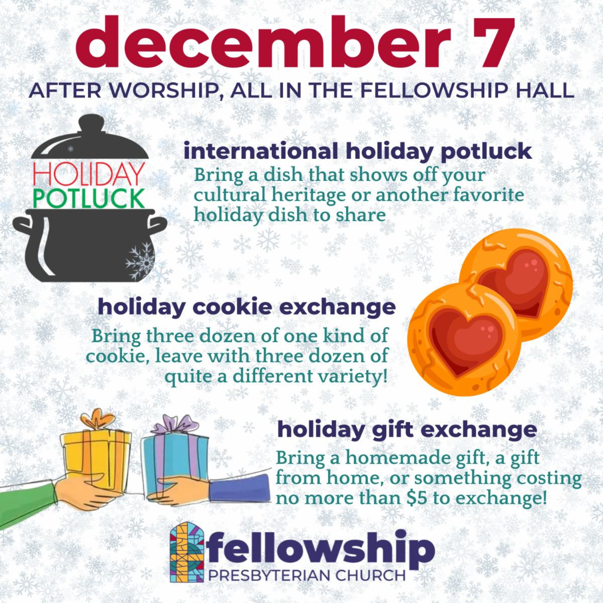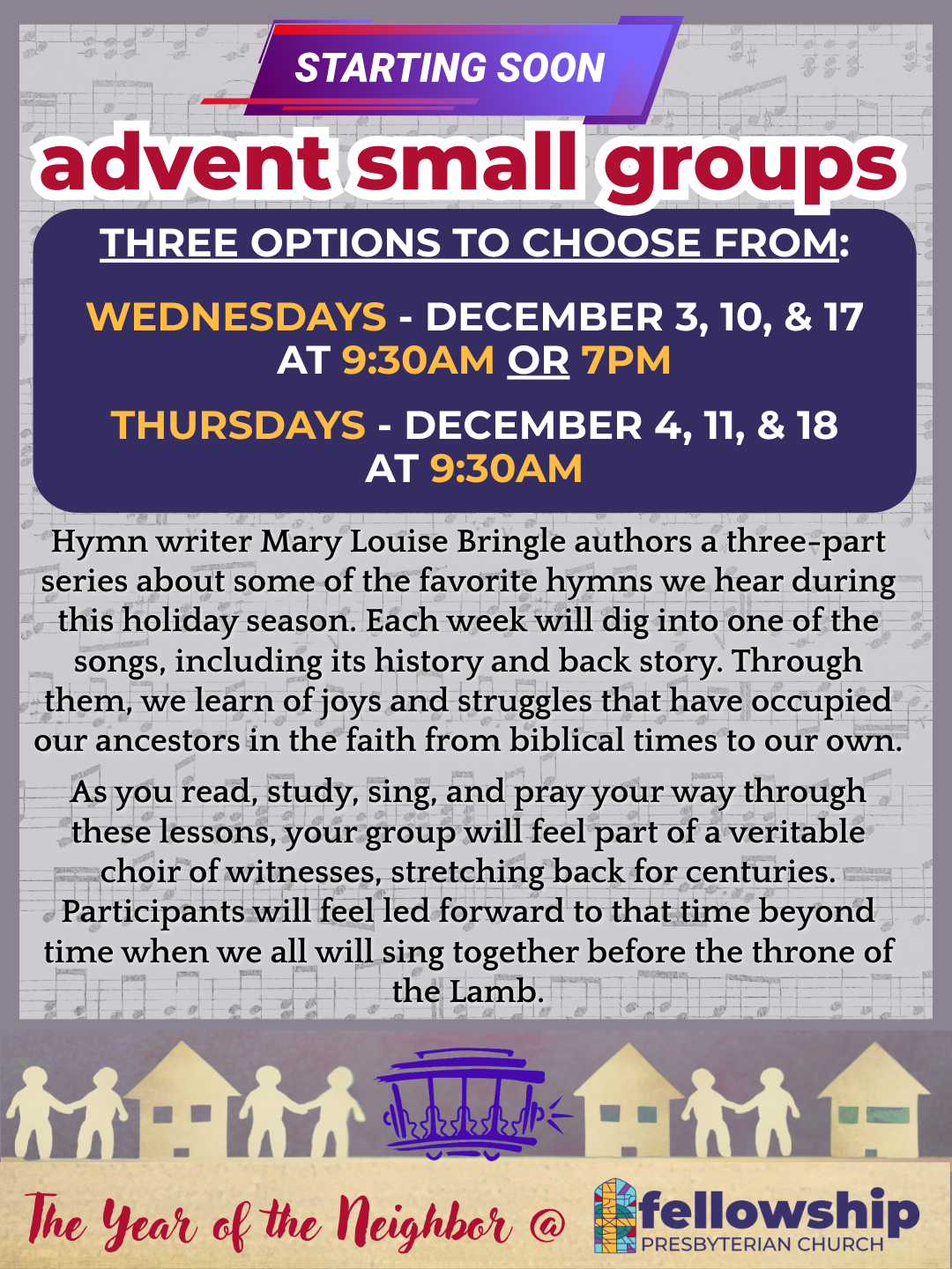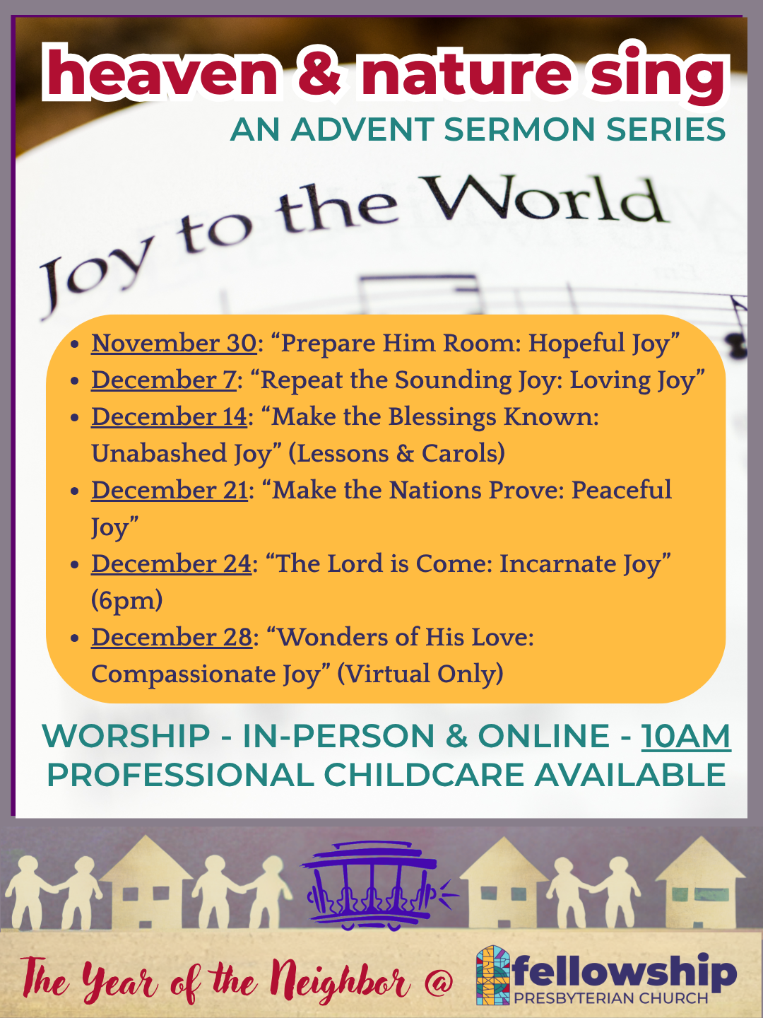 I hope that you are also marking your calendars to join us for some very special events in the life of our congregation in the next several weeks, including a potluck, cookie, and gift exchange after worship next week on Sunday December 7th, a concert by Dr. Richard Hodges and Dr. Jim Douglass on Saturday December 13th at 5:00PM in the sanctuary, as well as our annual Lessons & Carols service during the 10:00AM worship time on Sunday December 14th featuring Dr. Hodges again as a special musical guest.