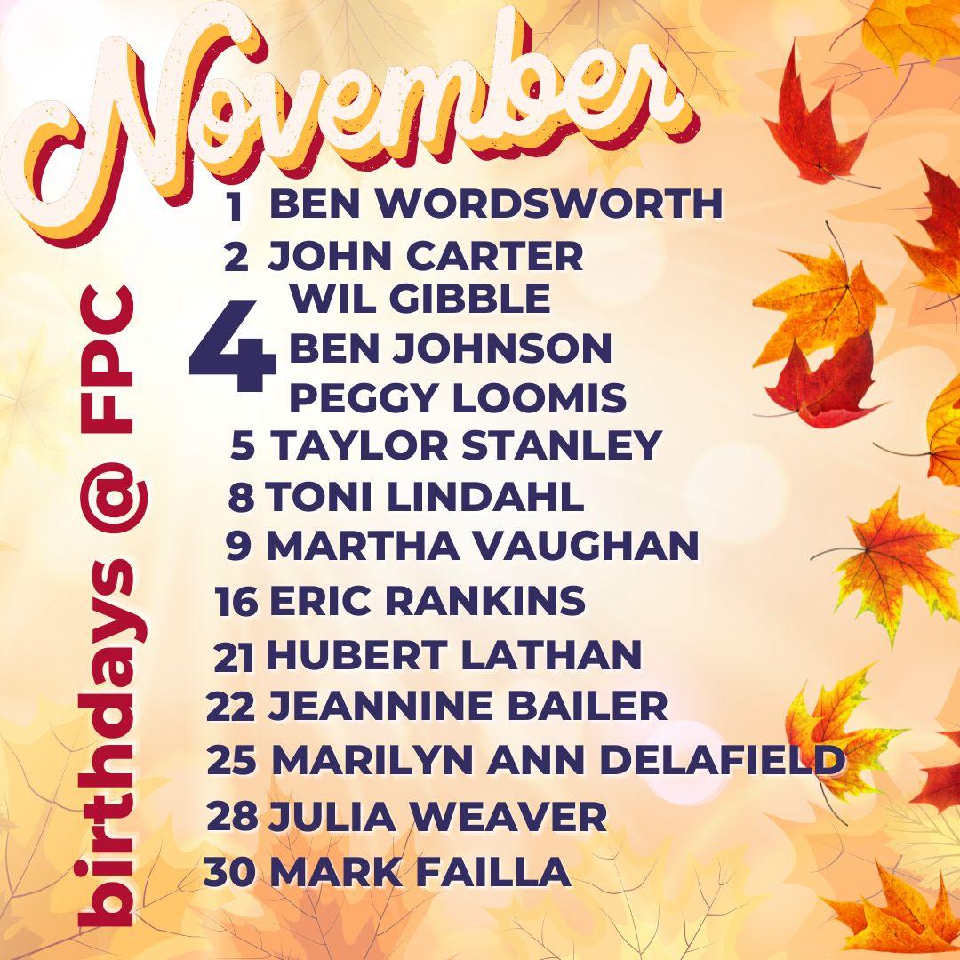 Fellowship family, we are called by God to do the work of love in the world. The Holy Spirit accomplishes God’s work of love and peace through our words and our thoughts and our deeds. I pray in this season of gratitude that you’ll take time to reach out to those people whom God has laid on your heart and on your mind. Let them know you’re thinking of them and praying for them.