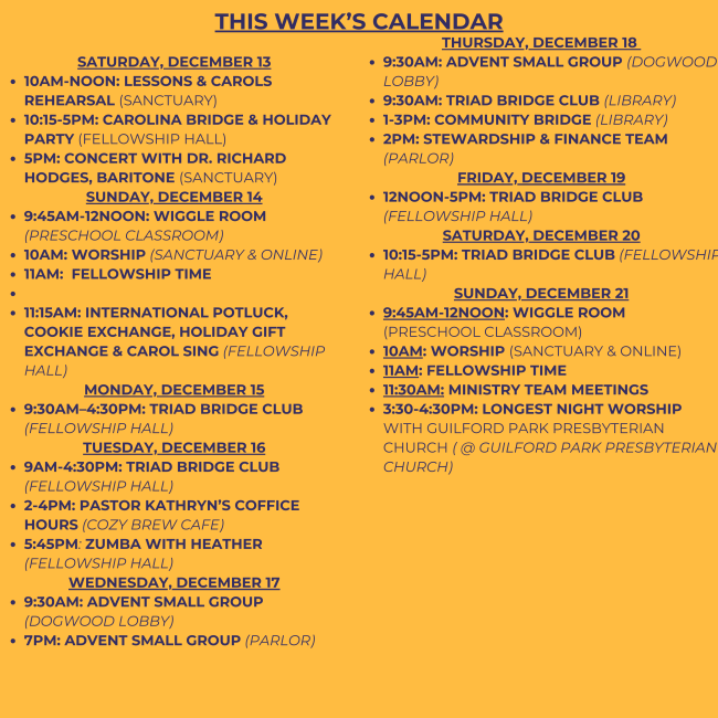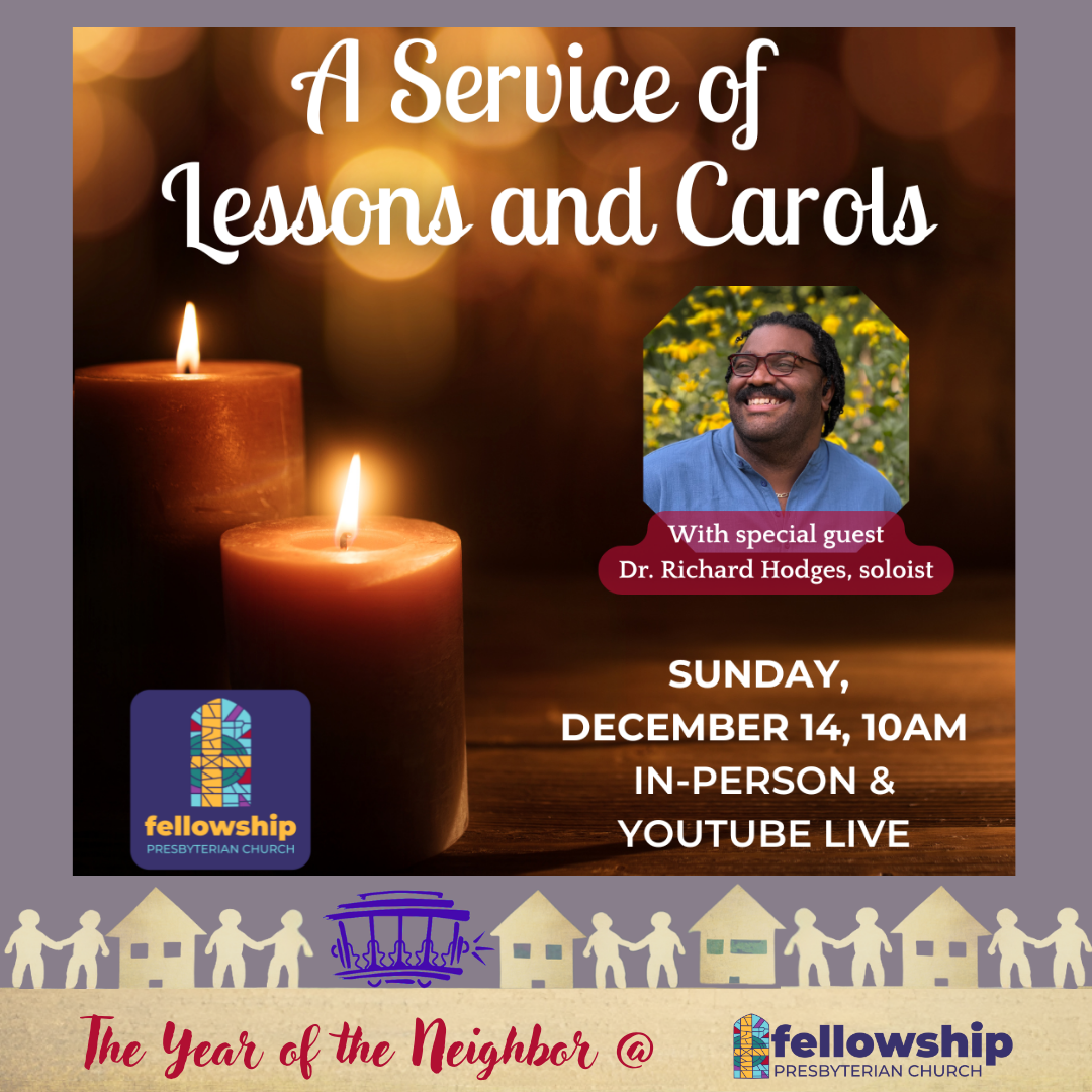 I hope you can also join us in worship as we gather together again this Sunday. We will play and sing together in our annual Lessons & Carols service as we continue our Advent journey toward the coming birth of our Savior, Jesus Christ, into the world. For me, the Advent season isn't complete without this Advent tradition. Our vocal and bell ensembles have been working diligently to prepare. In case you're unaware, preparations usually begin in the late summer, with rehearsals including some of this music when the chancel choir returns after the Labor Day holiday in September. It is a labor of love, and also demonstrates the incredible talent and devotion of the music department at Fellowship. Filled with Scripture and music, including special music we have prepared just for the occasion! Richard will join us in worship, sharing his gifts and talents with our church family as well! We are delighted to share this wonderful tradition with our church family once again this year.