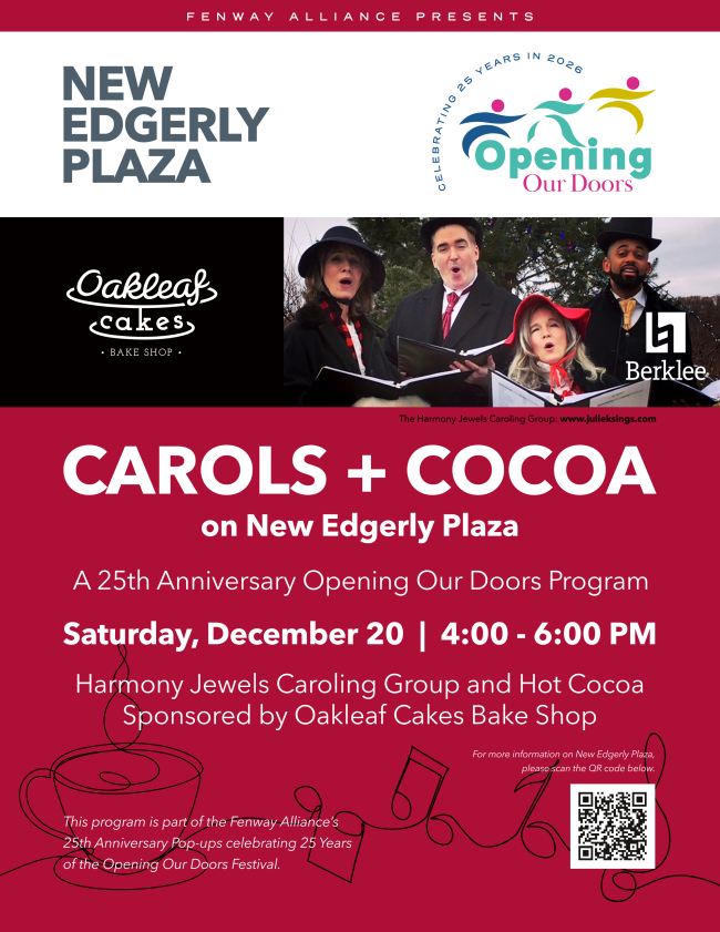 Join us on Saturday, December 20th from 4 - 6PM for an outdoor holiday concert at the Fenway's newest public gathering spot, New Edgerly Plaza. "Carols + Cocoa" is brought to you by the Fenway Alliance, Berklee College of Music, Harmony Jewels Caroling Group, and Oakleaf Bake Shop. We are delighted to offer this program as the first of our Opening Our Doors 25th Anniversary pop-ups, celebrating a quarter century of free art + culture programs on Opening Our Doors day. |