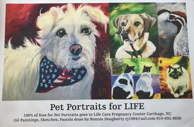 100% of your payment for her painting of your favorite pooch or kitty goes to the Life Care Pregnancy Center. This is Bonnie's ministry.