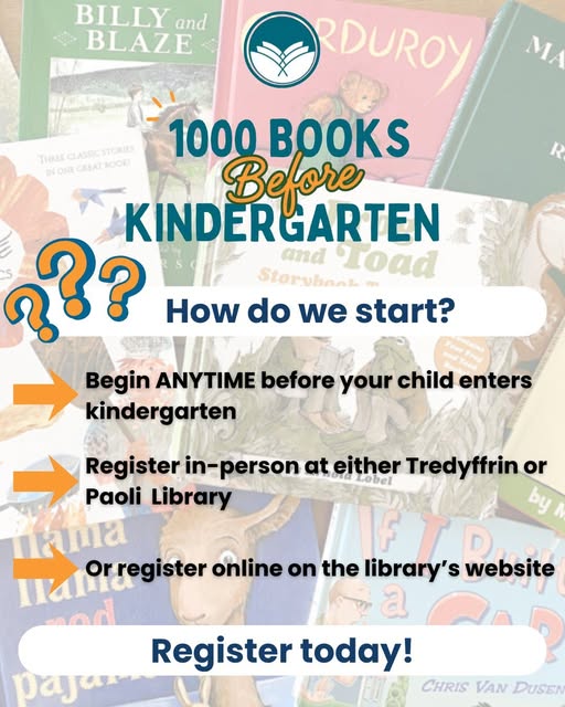 Here's GREAT new challenge for parents and grandparents! Help your kids read 1000 books before Kingdergarten. Any book will do! Read the same book 1000 times! (or dont...) The point is to get kids reading! Sign up now at the Tredyffrin or Paoli Libraries, or sign-up online by clicking HERE!