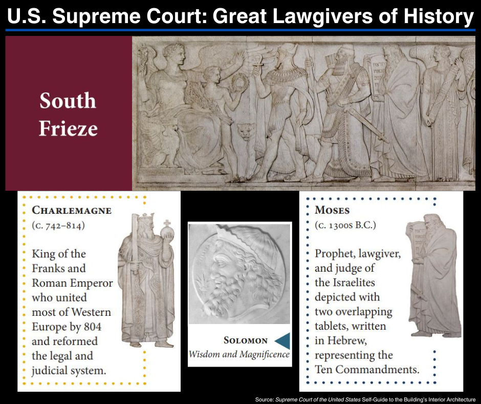 Within the halls of the U.S. Supreme Court, the “Great Lawgivers of History” wall sculpture depicts Moses holding the Ten commandments inscribed in Hebrew. This directly links a foundational text of Jewish tradition with Western law and the American legal system. Israel’s King Solomon – renowned for his “wisdom and magnificence” – also appears on the frieze. Other prominent historical figures include Justinian, Charlemagne and Muhammad, illustrating the diverse heritage of legal thought recognized within America.