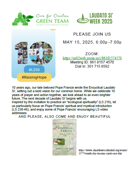Join us! St. Matthew’s Care for Creation GREEN Team warmly invites you to join a celebration of the 10th anniversary of Laudato Si’. Laudato Si’ is our late Pope Francis’s encyclical on ecology and care for our common home, a document that stands on centuries of Catholic teaching from St. Francis to Pope Benedict XVI and beyond. We’ll meet Thursday, May 15, 6-7pm. Please find the link to the Zoom meeting HERE. | | | |