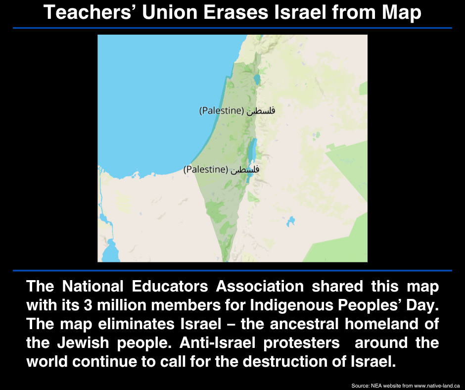 The problem is not limited to individual classrooms – it often begins at the very top of the education establishment. The National Education Association – the largest teachers’ union in the U.S. – recently promoted Indigenous Peoples’ Day materials that erased Israel entirely from the map. The image labeled the territory – including the Jewish ancestral regions of Judea, Samaria and Jerusalem – as Palestine. Jewish organizations condemned the “antisemitic tropes and attempts to rationalize the atrocities of Oct. 7.”