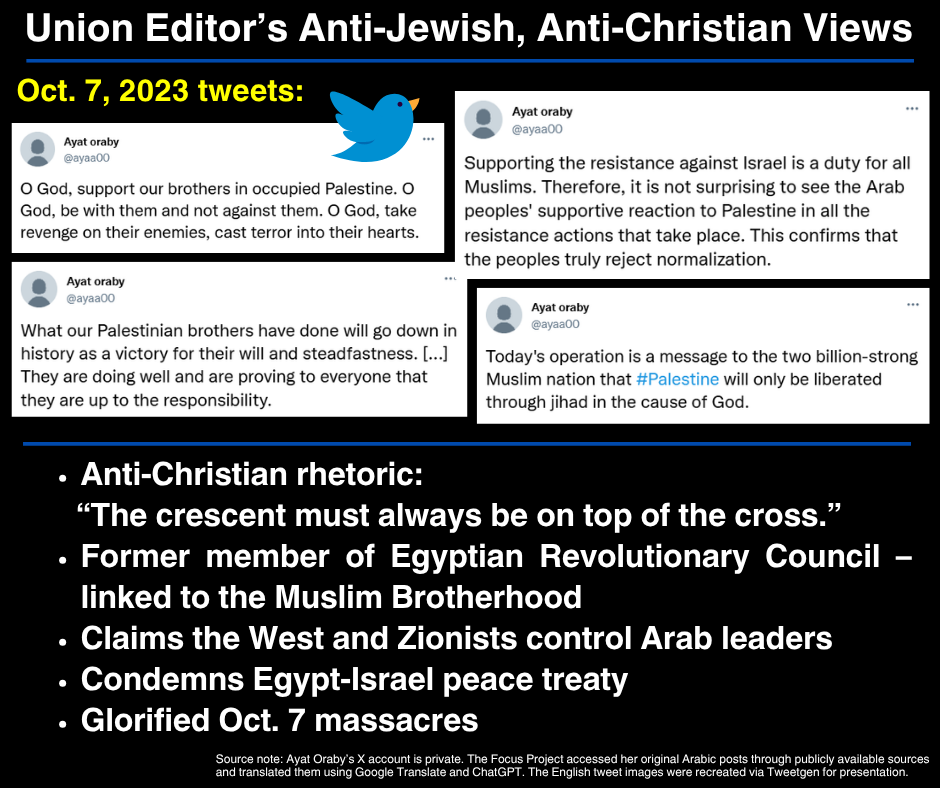 This incident is not isolated. In New Jersey, lawmakers demanded action after a magazine editor of NJ’s NEA chapter, Ayat Oraby, posted vile anti-Christian, anti-Jewish and pro-Hamas messages on social media to her more than 1 million followers: