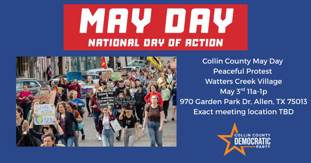 This May 3rd, join us at Watters Creek to observe May Day and raise our voices in solidarity with workers, labor unions, and immigrant communities! As the Trump Administration continues to threaten labor rights and enact cruel, inhumane immigration policies, including family separations and mass deportations, we refuse to stay silent. Together, we’ll protest systemic overreach and demand justice for ALL.