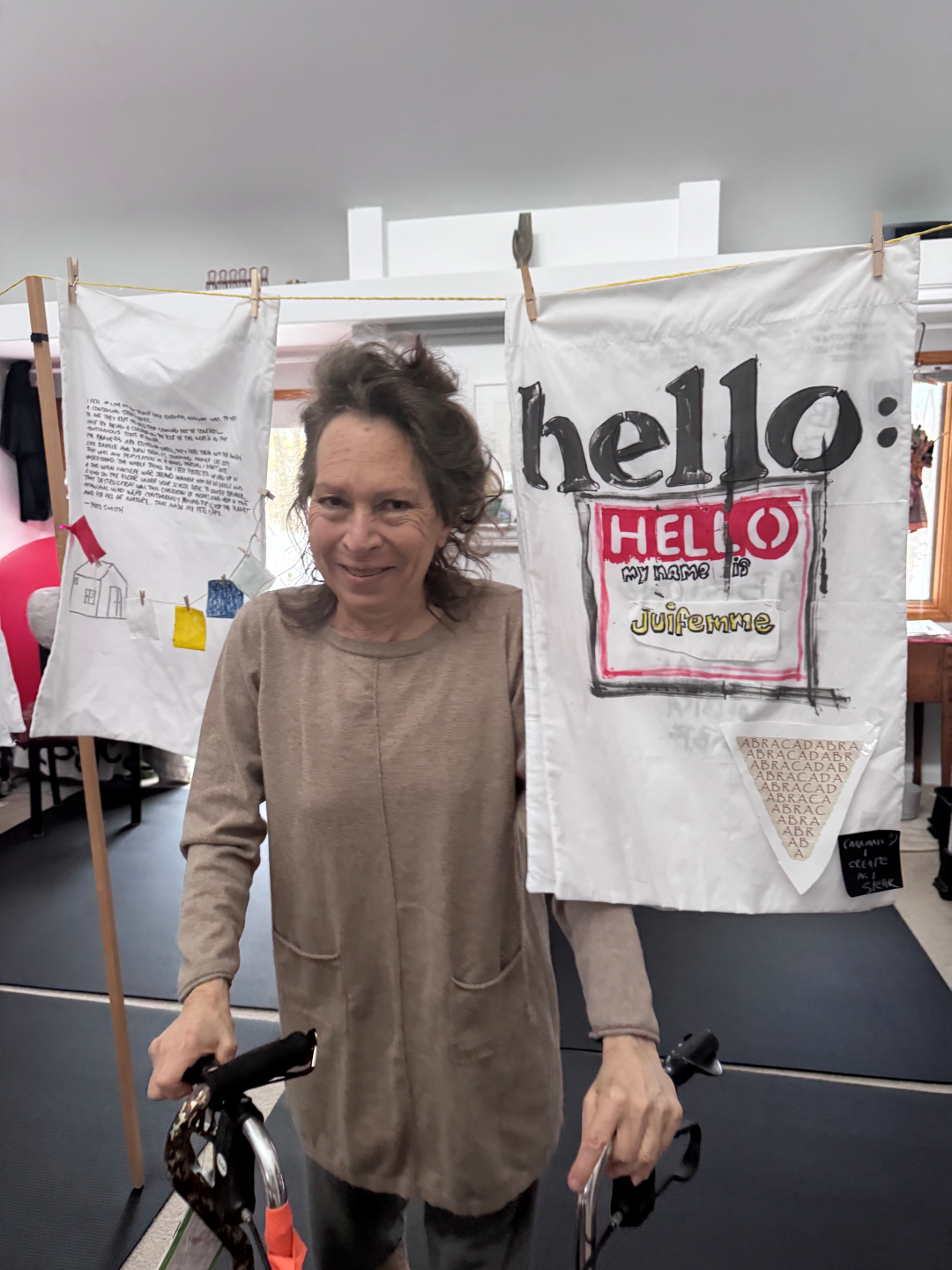 Visitors can expect a mixed-media environment spanning multiple rooms. In the main gallery, three clotheslines stretch across the space, hung with standard white pillowcases printed, painted, and hand-drawn with poems, slogans, quotes, homages, images, and prayers. Sack likens these to a hybrid of prayer flags, protest posters, disability signage, and fortune-cookie slips; intimate messages elevated into banners. The gallery will also feature recorded personal, political, and spiritual texts playing in a loop, creating shifting, chance-based layers of sound and meaning as visitors move through the exhibition.