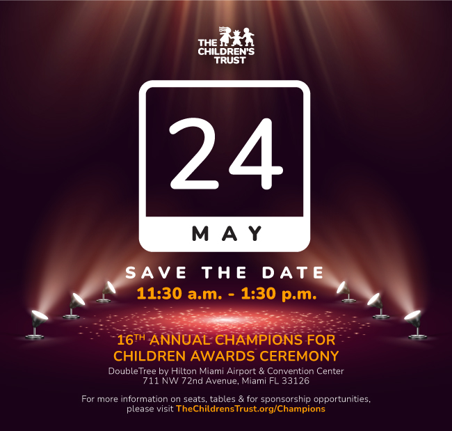 Save the date for The Children's Trust Champions for Children Award Ceremony as it returns for its 16th annual celebration at an in-person event on Tuesday, May 24, from 11:30 a.m.-1:30 p.m., at the DoubleTree by Hilton Miami Airport and Convention Center, 711 NW 7nd Avenue, Miami, FL 33126.