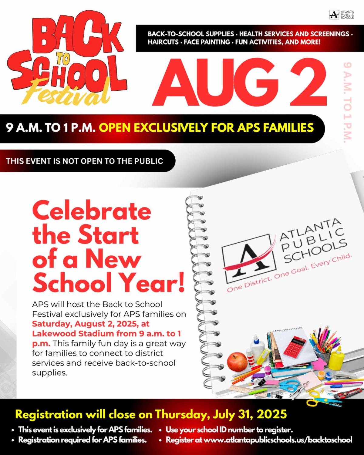 Mark your calendars for a day of fun, connection, and celebration at the APS Back to School Festival on Saturday, August 2, 2025, from 9 a.m. to 1 p.m. at Lakewood Stadium! From school supplies to student services, it’s the perfect way to gear up for the new year while celebrating the incredible families that make our community so special. Let’s start the school year off right — together! Registration will close on Thursday, July 31.